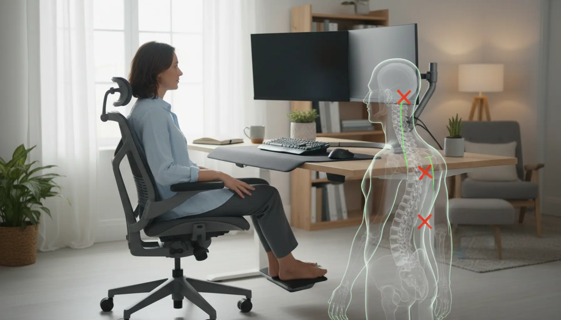 The chair is the centerpiece of an ergonomic workstation, as it primarily determines the position of your spine, pelvis, shoulders, and legs throughout the workday. A well-chosen, well-adjusted chair acts as an “active corset,” supporting the spine’s natural curves, offloading muscles, and enabling correct sitting posture without excessive effort. A seat that’s too hard, lacks lumbar support, or has too low a backrest pushes your body to find relief, often resulting in slouching, head thrusting forward, and overloading the cervical and lumbar regions. An ergonomic office chair should allow seat height, depth, backrest height and angle, and armrest adjustment. The quality of foam and frame is also important—too soft, and the pelvis sinks in, making it hard to keep a straight back; too hard presses the buttocks and backs of the thighs, impeding blood flow. A properly contoured seat with a gently rounded front relieves thigh and knee pressure and helps maintain hip and knee angles close to 90–100°, fostering a stable, balanced position. Seat height should allow your feet to rest entirely on the floor or footrest, with knees level with or just below the hips; if your feet “hang” above the floor, your body compensates for the lack of support by overloading the lumbar spine or pelvis, raising the risk of back pain and leg numbness. The chair’s base matters too—a sturdy, five-legged base with casters suited to your floor lets you move and turn easily, so you don’t have to twist your torso unnaturally to reach documents or talk to a coworker, protecting your spine from microtrauma. The chair thus serves not just as a seat, but as a tool for controlled, dynamic movement—a mechanism allowing rocking, reclining, and shifting the angle between trunk and thighs encourages micro-movements and keeps muscles from stiffening.